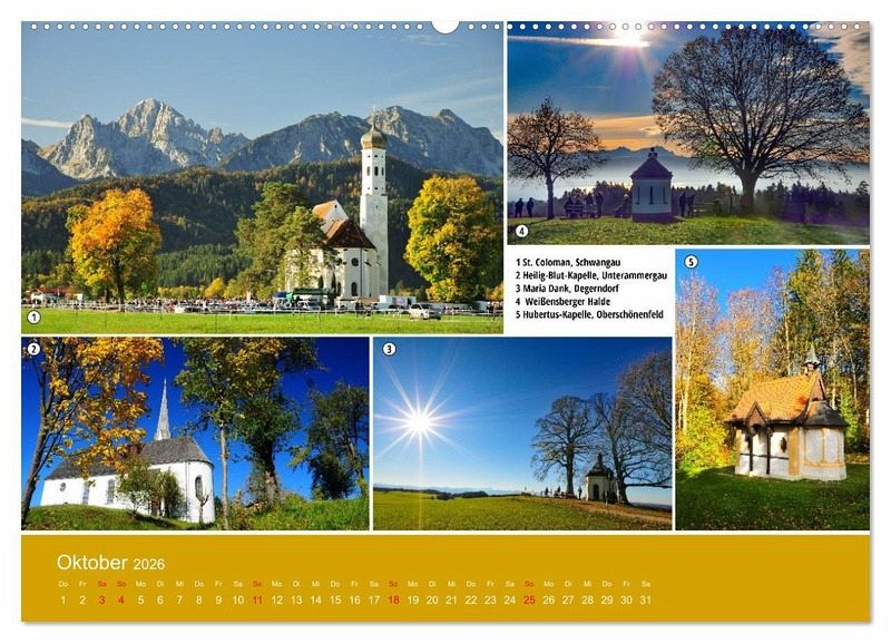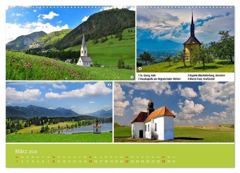 Was wären das Allgäu und Tirol ohne Kirchtürme und Kapellen? Sie gehören zum Heimatgefühl wie Berge und Biergärten. Nehmen Sie die Kalenderblätter einfach als Anlass zu einer Entdeckungstour. Über 40 idyllisch gelegene Kirchen und Kapellen, die auch als Ausflugsziel lohnen, bietet dieser einzigartige Kalender.