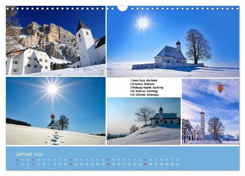 Was wären das Allgäu und Tirol ohne Kirchtürme und Kapellen? Sie gehören zum Heimatgefühl wie Berge und Biergärten. Nehmen Sie die Kalenderblätter einfach als Anlass zu einer Entdeckungstour. Über 40 idyllisch gelegene Kirchen und Kapellen, die auch als Ausflugsziel lohnen, bietet dieser einzigartige Kalender.