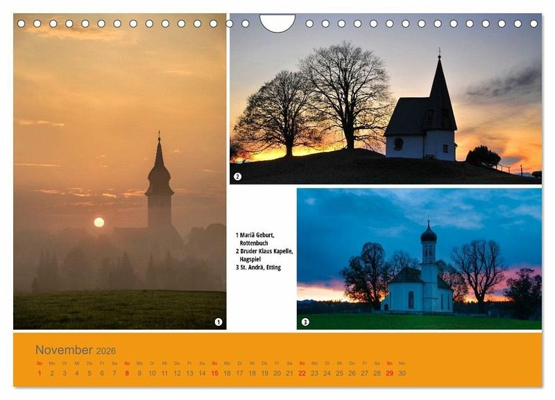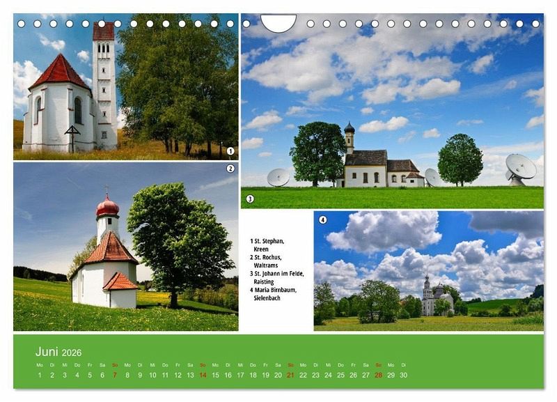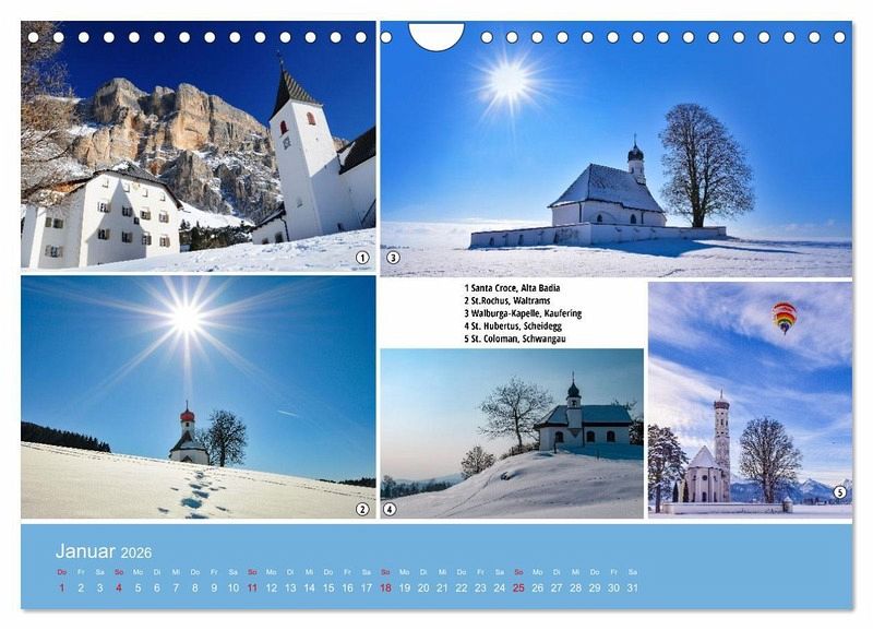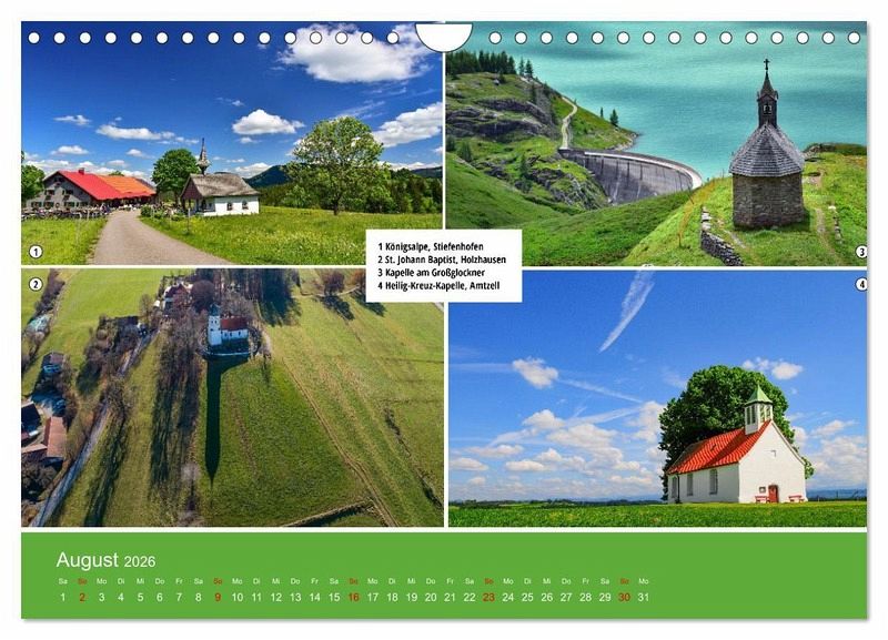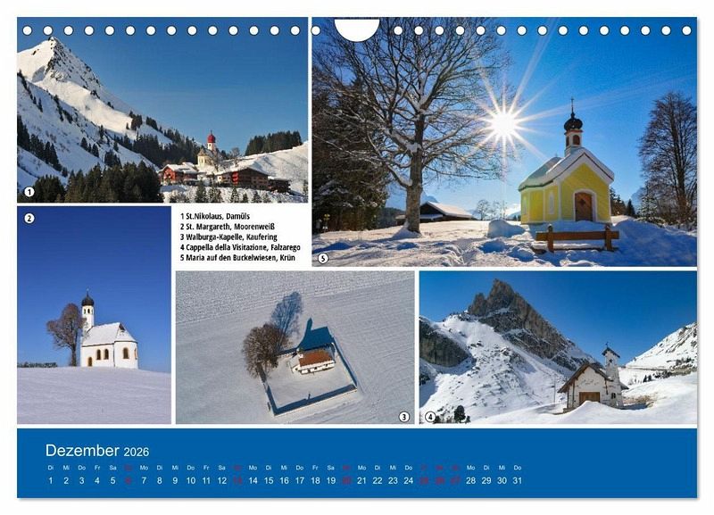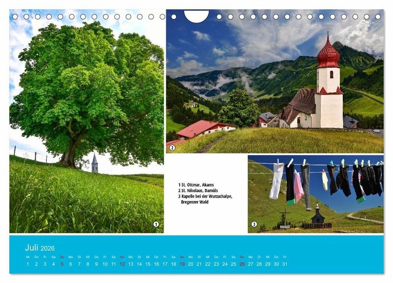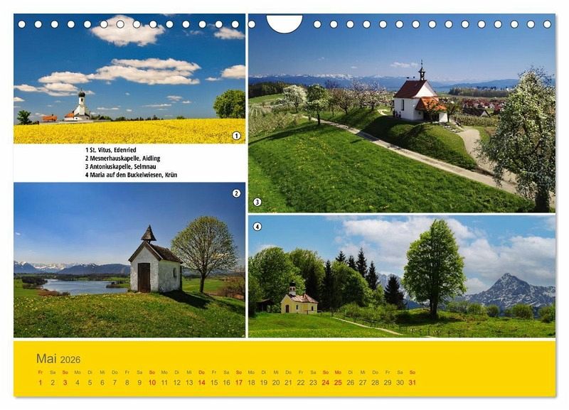 Was wären das Allgäu und Tirol ohne Kirchtürme und Kapellen? Sie gehören zum Heimatgefühl wie Berge und Biergärten. Nehmen Sie die Kalenderblätter einfach als Anlass zu einer Entdeckungstour. Über 40 idyllisch gelegene Kirchen und Kapellen, die auch als Ausflugsziel lohnen, bietet dieser einzigartige Kalender.