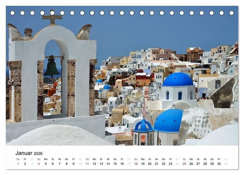 Januar: Blick auf mehrere Kirchen an der Steilküste von Oia