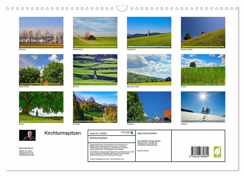 QUALITÄT - Hochwertiger Fotokalender mit 12 wunderschönen Motiven auf lichtbeständigem Bilderdruckpapier, robuste Spiralbindung mit Aufhängebügel.NACHHALTIG - deutliche Abfallreduzierung durch bedarfsgerechte Einzelstückfertigung, umweltfreundliches FSC-zertifiziertes Papier, Produktion in Deutschland, klimabewusste Logistik.PERFEKTES GESCHENK - Kalender für Freunde und Familie, für Kinder und Erwachsene, jung und alt, zu Weihnachten, Geburtstag oder zwischendurch.VIELFALT - Bildkalender in verschiedenen Formaten, z.B. DIN A5, DIN A4, DIN A3 sowie DIN A2. Ob Naturmotiv, Gemälde oder Fotos, ideal für ein persönliches Wohlfühlambiente.Schüchtern, vorwitzig und manchmal stolz recken sich die Kirchturmspitzen dem Wanderer überraschend entgegen. von Autor(in): Reinhold Ratzer