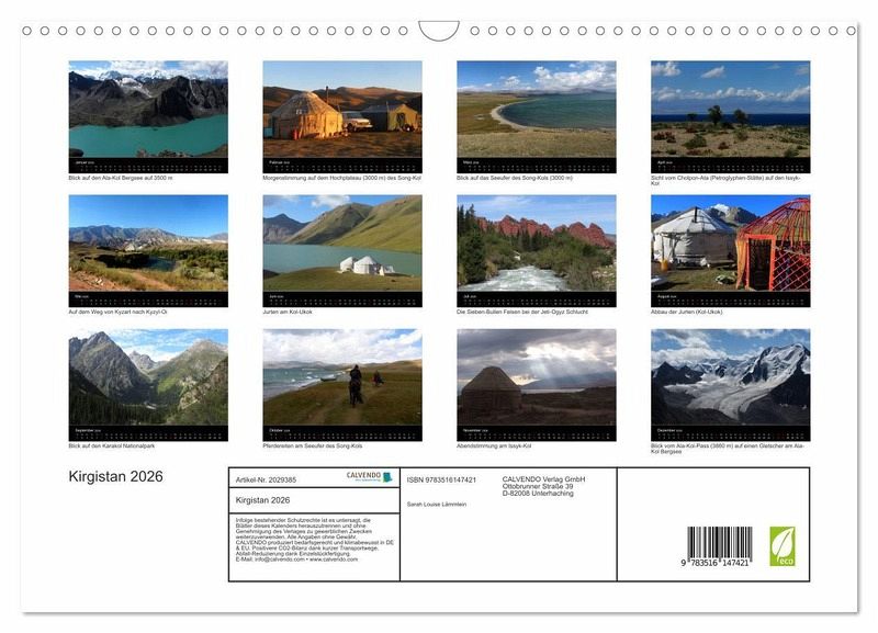 QUALITÄT - Hochwertiger Fotokalender mit 12 wunderschönen Motiven auf lichtbeständigem Bilderdruckpapier, robuste Spiralbindung mit Aufhängebügel.NACHHALTIG - deutliche Abfallreduzierung durch bedarfsgerechte Einzelstückfertigung, umweltfreundliches FSC-zertifiziertes Papier, Produktion in Deutschland, klimabewusste Logistik.PERFEKTES GESCHENK - Kalender für Freunde und Familie, für Kinder und Erwachsene, jung und alt, zu Weihnachten, Geburtstag oder zwischendurch.VIELFALT - Bildkalender in verschiedenen Formaten, z.B. DIN A5, DIN A4, DIN A3 sowie DIN A2. Ob Naturmotiv, Gemälde oder Fotos, ideal für ein persönliches Wohlfühlambiente.Landschaftsbilder von einer Trekkingreise um den Issyk-Kol-See in Kirgistan. von Autor(in): Sarah Louise Lämmlein