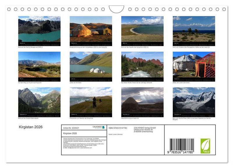 QUALITÄT - Hochwertiger Fotokalender mit 12 wunderschönen Motiven auf lichtbeständigem Bilderdruckpapier, robuste Spiralbindung mit Aufhängebügel.NACHHALTIG - deutliche Abfallreduzierung durch bedarfsgerechte Einzelstückfertigung, umweltfreundliches FSC-zertifiziertes Papier, Produktion in Deutschland, klimabewusste Logistik.PERFEKTES GESCHENK - Kalender für Freunde und Familie, für Kinder und Erwachsene, jung und alt, zu Weihnachten, Geburtstag oder zwischendurch.VIELFALT - Bildkalender in verschiedenen Formaten, z.B. DIN A5, DIN A4, DIN A3 sowie DIN A2. Ob Naturmotiv, Gemälde oder Fotos, ideal für ein persönliches Wohlfühlambiente.Landschaftsbilder von einer Trekkingreise um den Issyk-Kol-See in Kirgistan. von Autor(in): Sarah Louise Lämmlein