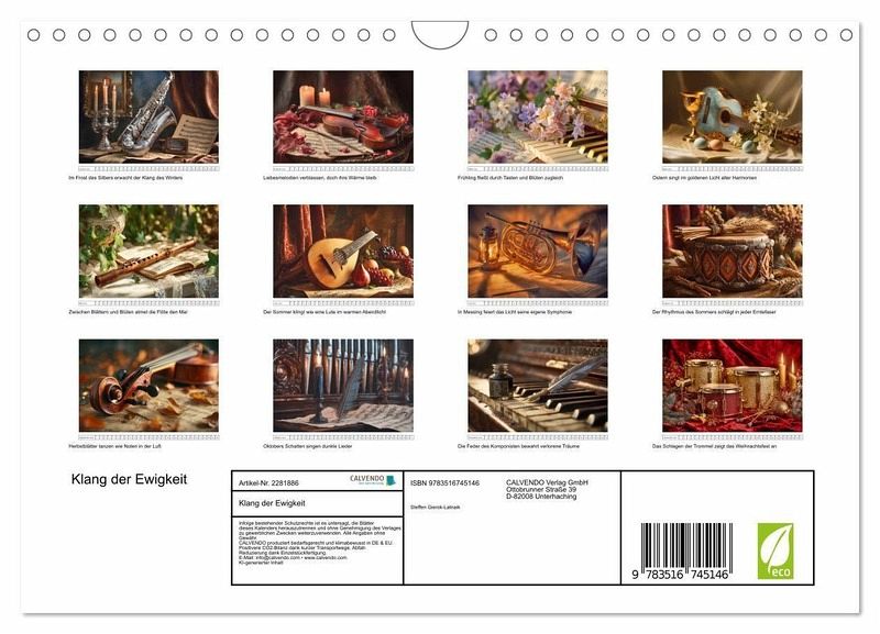 Hier verschmelzen Klang und Kunst zu einer visuellen Symphonie. Dieser Kalender zelebriert die Schönheit barocker Musik in emotionalen Stillleben - elegant, dramatisch, beeindruckend. Perfekt für alle, die Musik nicht nur hören, sondern fühlen. Alle hier gezeigten Bilder wurden mit Sorgfalt, Liebe und mit Hilfe einer KI generiert. Abschließend werden sie mit Bildbearbeitungsprogrammen überarbeitet und in den Kalender eingefügt.