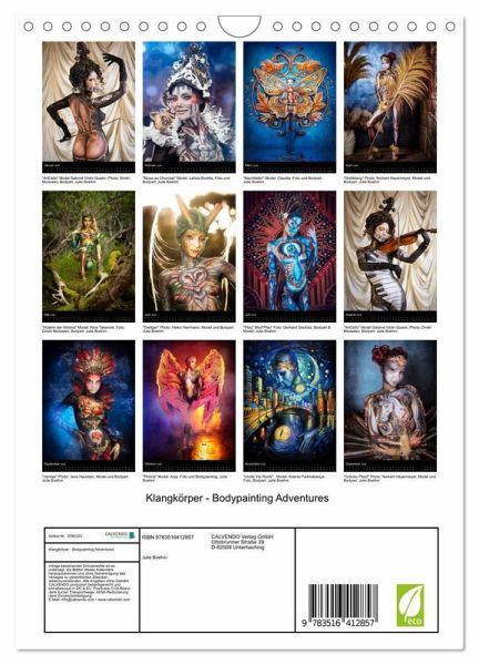 QUALITÄT - Hochwertiger Fotokalender mit 12 wunderschönen Motiven auf lichtbeständigem Bilderdruckpapier, robuste Spiralbindung mit Aufhängebügel.NACHHALTIG - deutliche Abfallreduzierung durch bedarfsgerechte Einzelstückfertigung, umweltfreundliches FSC-zertifiziertes Papier, Produktion in Deutschland, klimabewusste Logistik.PERFEKTES GESCHENK - Kalender für Freunde und Familie, für Kinder und Erwachsene, jung und alt, zu Weihnachten, Geburtstag oder zwischendurch.VIELFALT - Bildkalender in verschiedenen Formaten, z.B. DIN A5, DIN A4, DIN A3 sowie DIN A2. Ob Naturmotiv, Gemälde oder Fotos, ideal für ein persönliches Wohlfühlambiente.Ein außergewöhnlicher Bodypainting-Kalender, in dem bemalte Körper mit Natur, Fantasie und sinnlichen Musen verschmelzen - von wilden Landschaften bis zu surrealen Kunstwelten. von Autor(in): Julie Boehm