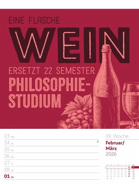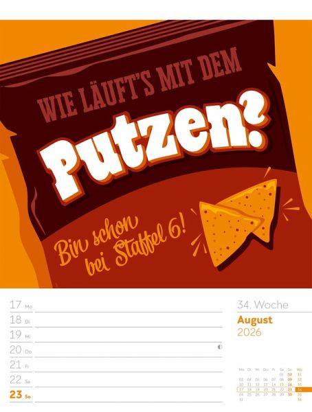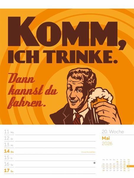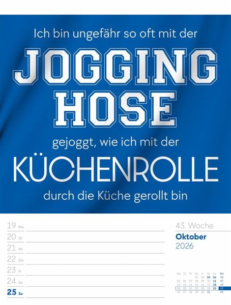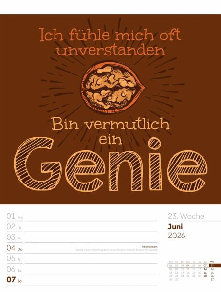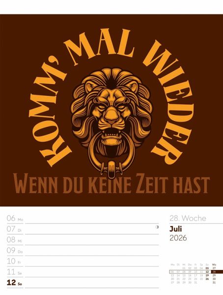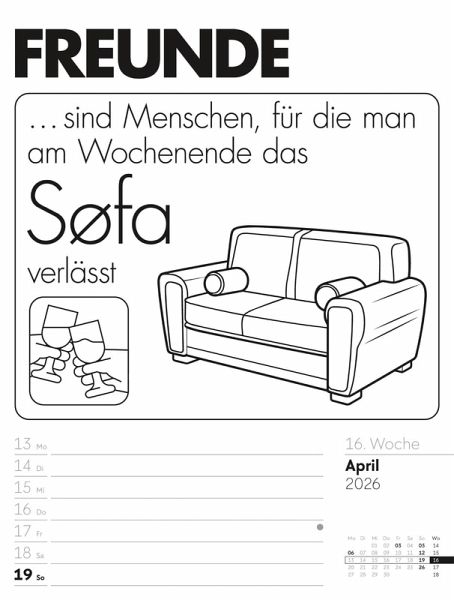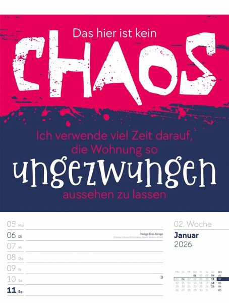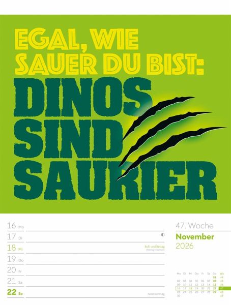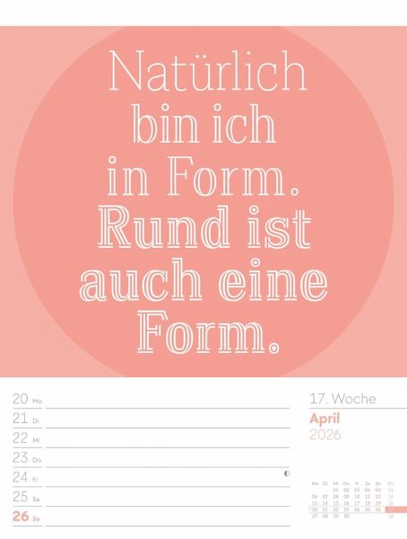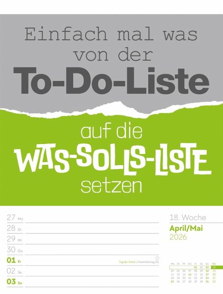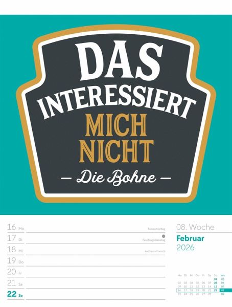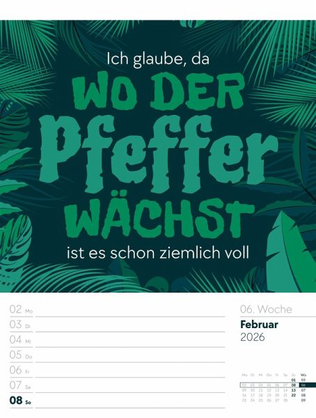 Wochenkalender mit 53 frechen und typografisch perfekt inszenierten Sprüchen Sprüche-Kalender im Hochformat: 25x33 cm Mit übersichtlichem Eintragekalendarium sowie Kreuzworträtseln und Sudokus auf jeder Rückseite Auf Papier aus nachhaltiger Forstwirtschaft in Deutschland produziert, mit Spiralbindung Leistet einen Beitrag zum Ackermann Firmenwald Deutschsprachiges Kalendarium