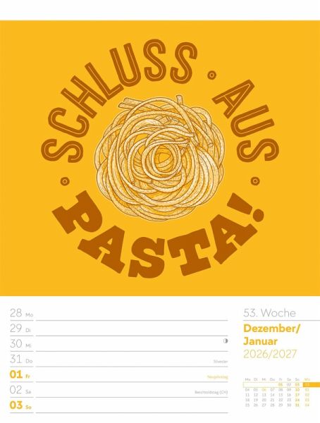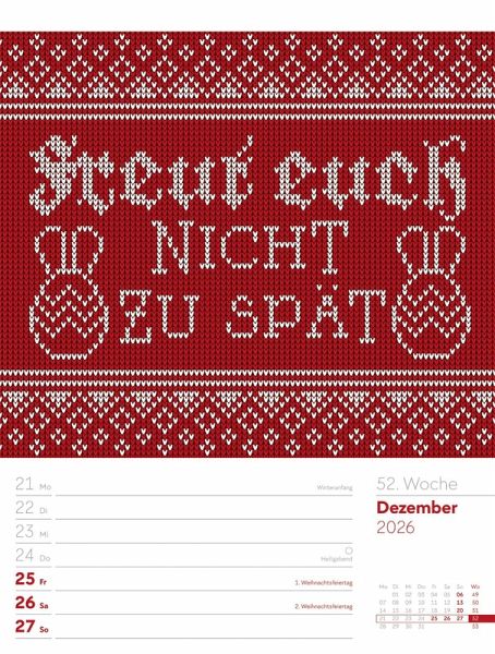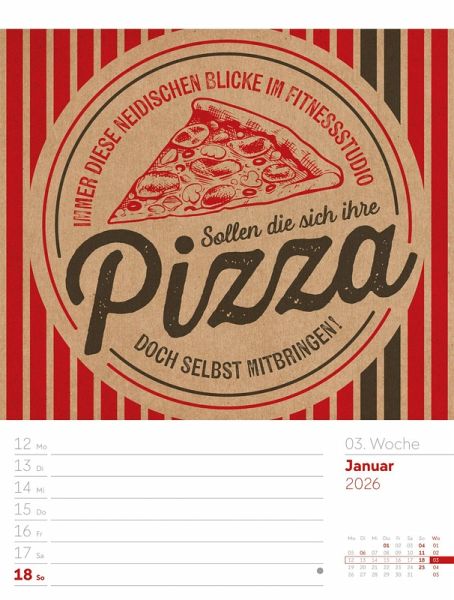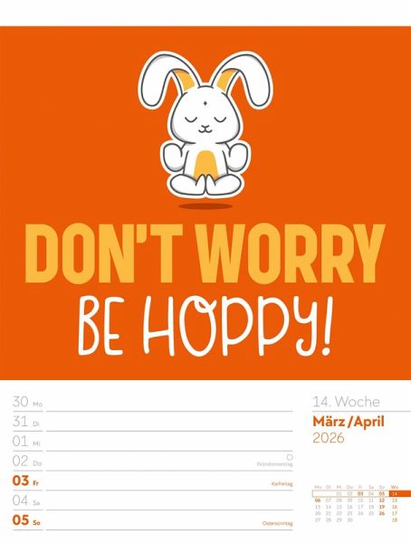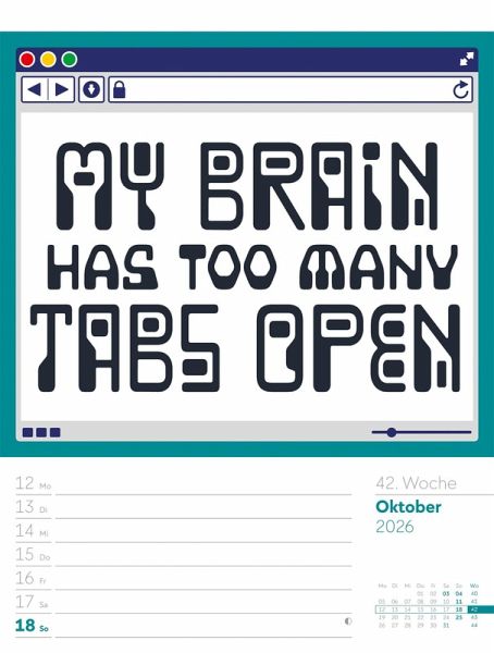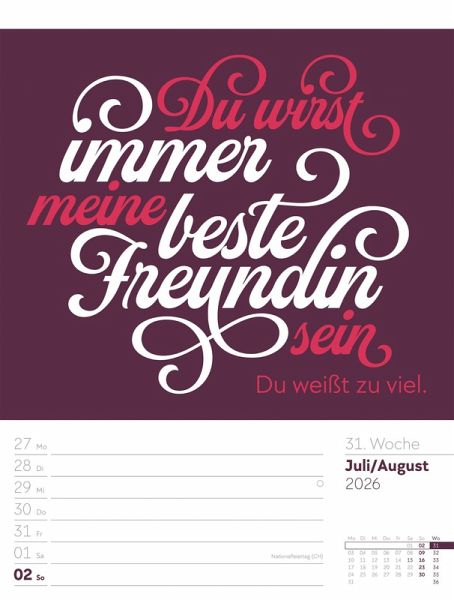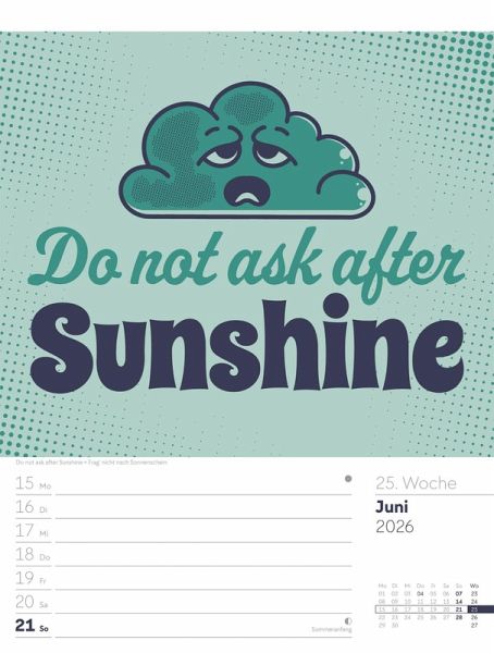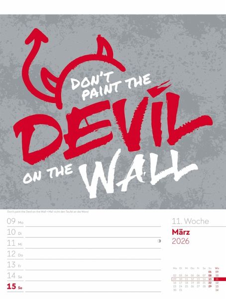 Wir sprechen Klartext! Mit 53 frechen Sprüchen und viel Wortwitz bringen wir Farbe und ein Lächeln in Ihren Alltag. Wer es bunt und abwechslungsreich mag, zudem ein Fan von Typografie und toll gestalteter Schriftdeko ist, greift hier zum richtigen Wandschmuck. Übersichtliches Kalendarium mit Platz für Ihre Einträge und dazu jede Woche neuer Rätselspaß: Kreuzworträtsel und Sudokus auf allen Rückseiten.