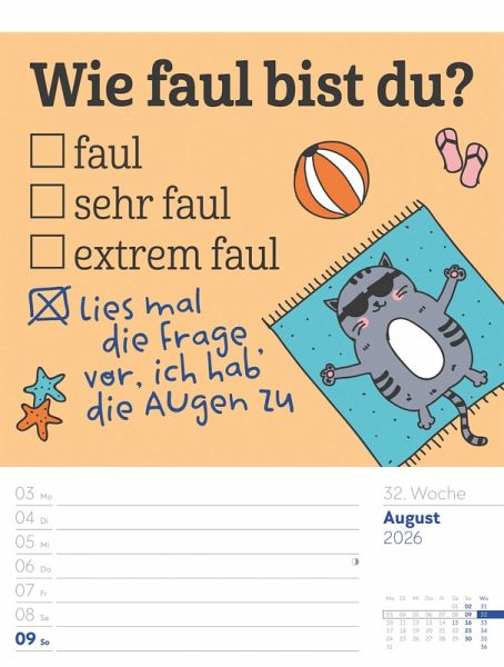 Wie alle Ackermann-Kalender ausschließlich in Deutschland auf Papier gedruckt, das aus vorbildlich bewirtschafteten, FSC®-zertifizierten Wäldern und anderen kontrollierten Quellen stammt. Transparente CO2-Kompensation in Kooperation mit unserem Klimapartner NatureOffice, bei der nachweislich Treibhausgase reduziert sowie die lokale Umwelt und die Belange der Bevölkerung gefördert werden. Auch eine schöne Geschenkidee für Menschen mit Sinn für Humor, Fans von frechen Sprüchen und lustigen Zitaten, Freund:innen von Memes und Netzkultur und natürlich für alle, die Spaß an Rätseln und Sudoku haben.