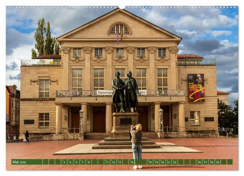 Weimar, gelegen in Thüringen, ist über 1.100 Jahre alt und hat etwa 65.000 Einwohner und bekannt als Klassikerstadt, ist nicht nur Heimat von Goethe und Schiller, sondern auch ein Zentrum der Bauhaus-Bewegung. Weniger bekannt ist, dass Weimar die erste deutsche Republik ausrief, die Weimarer Republik. Die Herzogin Anna Amalia Bibliothek beherbergt seltene Manuskripte und Bücher. Der Park an der Ilm, gestaltet von Goethe, bietet versteckte Pavillons und Denkmäler. Weimar ist ein UNESCO-Weltkulturerbe und ein Muss für Kulturinteressierte. Drachenkind-Fotografie fotografierte auf ihrer Fahrradtour entlang der Städtekette durch Thüringen diesen Regional-Kalender von Weimar.