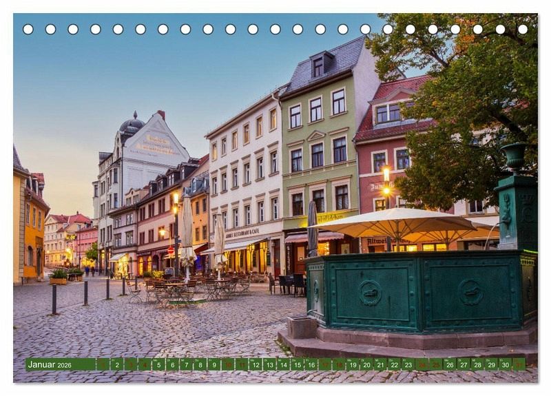 Weimar, gelegen in Thüringen, ist über 1.100 Jahre alt und hat etwa 65.000 Einwohner und bekannt als Klassikerstadt, ist nicht nur Heimat von Goethe und Schiller, sondern auch ein Zentrum der Bauhaus-Bewegung. Weniger bekannt ist, dass Weimar die erste deutsche Republik ausrief, die Weimarer Republik. Die Herzogin Anna Amalia Bibliothek beherbergt seltene Manuskripte und Bücher. Der Park an der Ilm, gestaltet von Goethe, bietet versteckte Pavillons und Denkmäler. Weimar ist ein UNESCO-Weltkulturerbe und ein Muss für Kulturinteressierte. Drachenkind-Fotografie fotografierte auf ihrer Fahrradtour entlang der Städtekette durch Thüringen diesen Regional-Kalender von Weimar.