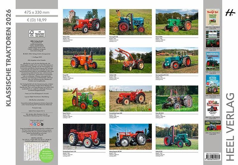 Die Traktor-Highlights in ihrer ganzen Pracht! Dieser großformatige Poster-Kalender präsentiert legendäre und originalgetreu restaurierte Schlepper. Ob Allgaier Porsche, Holder, Eicher, Lindner, Kramer, Ford, Güldner, Deutz , IHC, Deutz oder Hanomag - Profi-Fotograf Frank Lutzebäck hat die Schmuckstücke perfekt in Szene gesetzt. Die Auswahl ist ein Querschnitt durch die modell- und facettenreichen Schleppergeschichte und zeigt ausgesuchte Traktorraritäten. Fazit: Ein Muss für große und kleine Traktor-Fans! Mit großem Wandplaner für den perfekten Jahresüberblick. Hochwertige Ausstattung: - 14 Seiten Kunstdruckpapier - Cover mit Glanzlack veredelt - extra stabile Rückwand - silberne Spiralbindung - nachhaltig produziert.