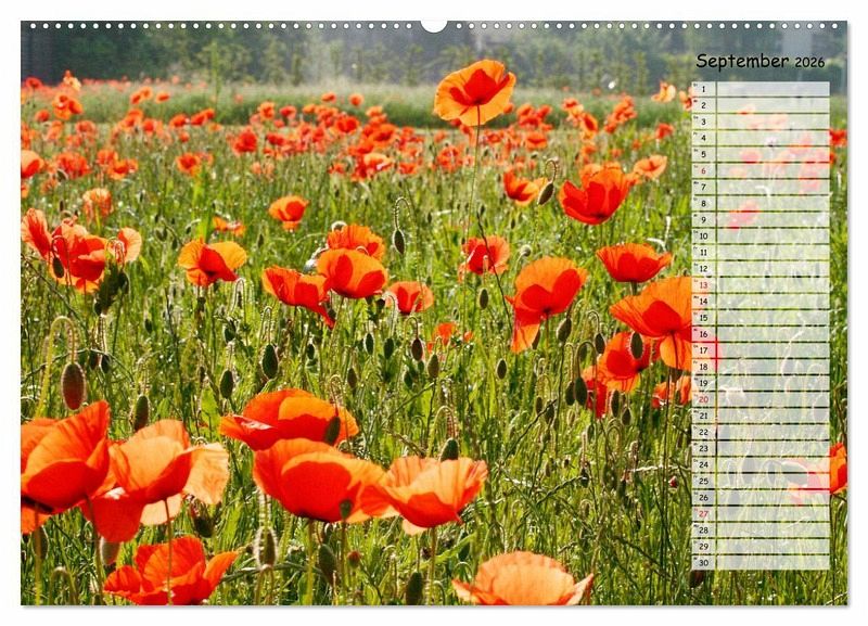 Mohnblüten sind das Synonym für den Sommer. Wenn der Wind über die Kornfelder streicht und die Farben darin zum Tanzen bringt, ist das immer wieder ein faszinierendes Schauspiel, das zum Träumen einlädt. Die leider so schnell verblühenden Mohnblumen sind mit diesem Kalender unsterblich und beglücken Sie ein volles Jahr.