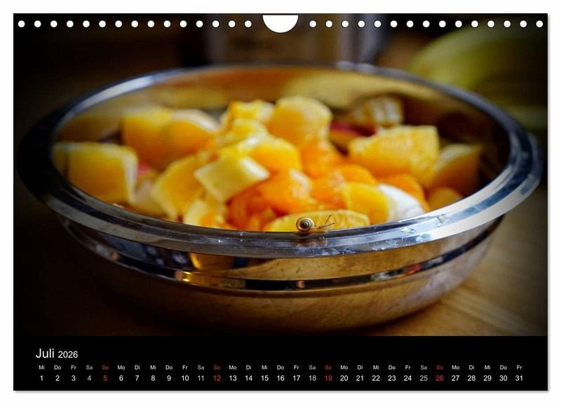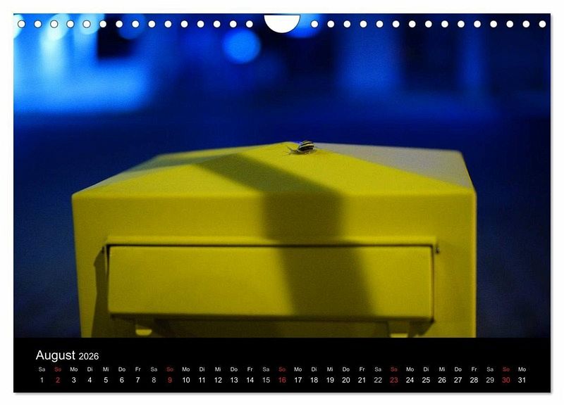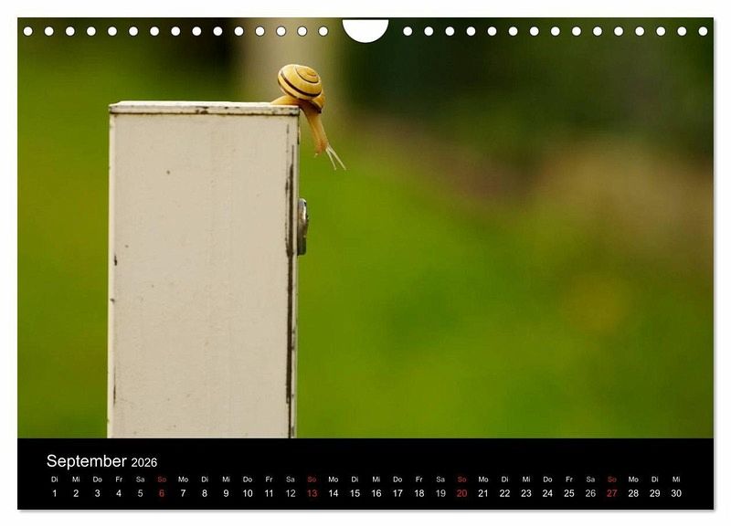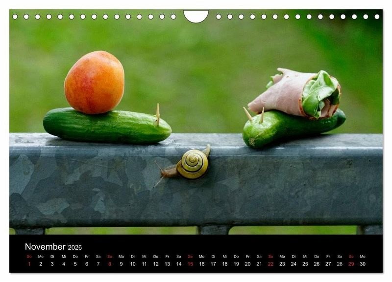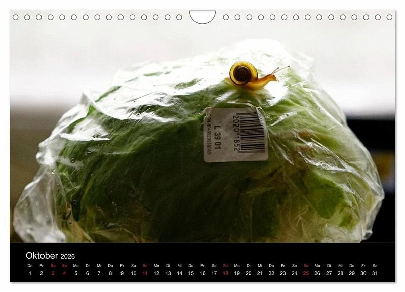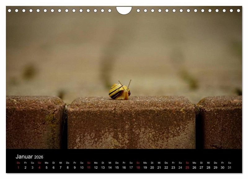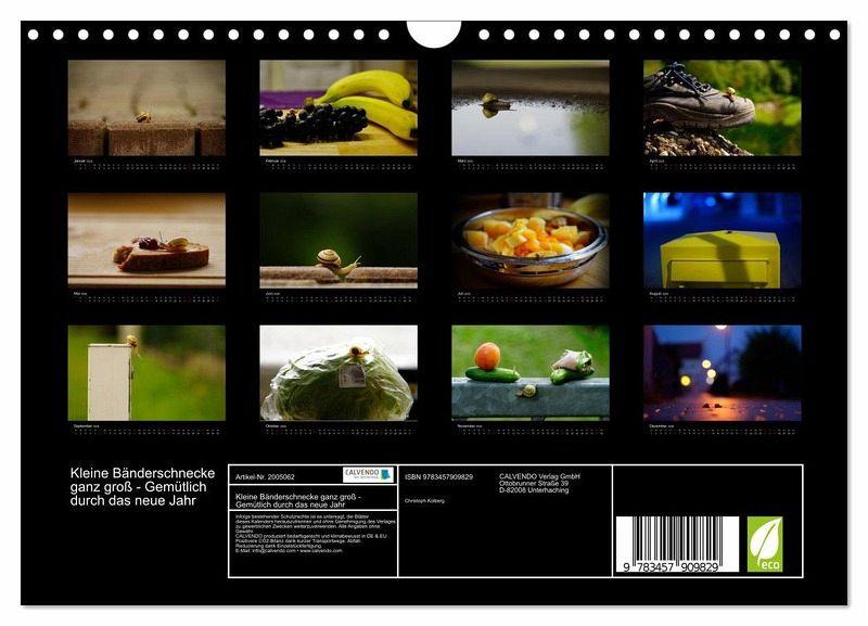 Oft werden Schnecken nur als lästig empfunden. Der Kalender will jedoch zeigen, dass sich eine genauere Betrachtung der kleinen Weichtiere lohnt. Jeder Monat zeigt die Bänderschnecke an einem anderen Ort: ob lustig oder niedlich, auf alle Fälle farbenfroh und eindrucksvoll. Ein gemütlicher Begleiter durch das neue Jahr.