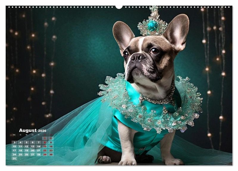 August: Französische Bulldogge trägt türkisfarbenes Abendkleid mit Krone
