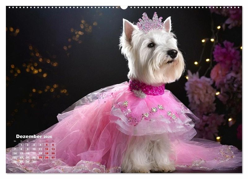 Dezember: West Highland Terrier trägt ein pinkfarbenes Abendkleid mit Diadem