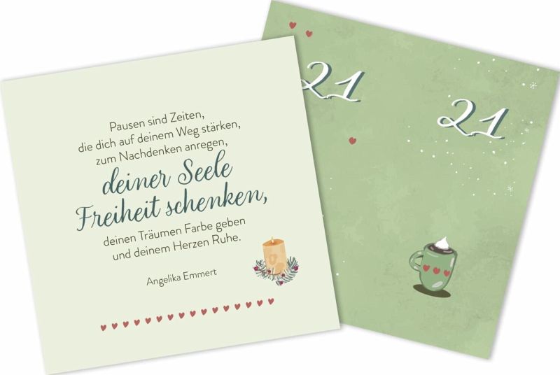 Dieser Adventskalender besteht aus 24 Zettelchen in einer hübschen Geschenkschachtel. Sie geben Tag für Tag hilfreiche Tipps, schenken Inspirationen und beschreiben kleine Übungen zum Innehalten und Loslassen. So kann man die Tage bis Weihnachten bewusst wahrnehmen und genießen. Ein wunderbares Geschenk für gestresste Mitmenschen, denen man Entspannung und Gelassenheit für die Adventszeit wünscht, und natürlich auch für sich selbst.