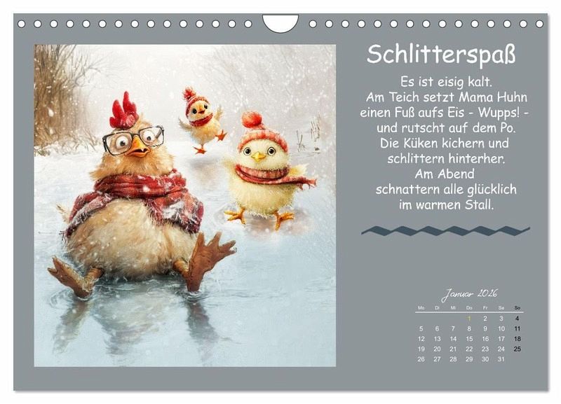 Dieser liebevoll illustrierte Kinderkalender begleitet die Kleinsten mit kurzen, fröhlichen Tiergeschichten durch das ganze Jahr. Ob lustige Hühner im Januar oder freche Frösche im Mai - jeden Monat wartet eine neue, bezaubernde Geschichte darauf, entdeckt zu werden. Perfekt zum Vorlesen, Staunen und Lachen - ein tierischer Begleiter für jeden Tag! Ideal für Kinder im Vorschulalter und ein schönes Ritual für Eltern, Großeltern oder Erzieher_innen. Die Bilder sind mit Unterstützung von KI entstanden, wurden künstlerisch gestaltet und liebevoll in Szene gesetzt.
