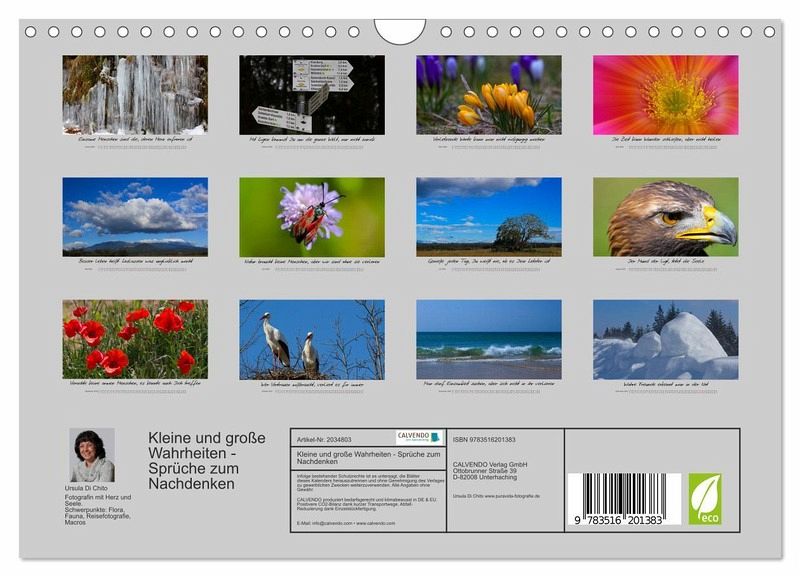 Hochwertiger Wandkalender mit 12 wunderschönen Bildern. Unsere Umwelt liegt uns am Herzen. Daher verwenden wir ausschließlich FSC-zertifizierte Papiere aus verantwortungsvoller Waldwirtschaft. Wir vermeiden Überproduktion und somit deutliche Abfallmengen, da wir bedarfsgerecht in Einzelfertigung in Deutschland (Made in Germany) produzieren. Wir halten unsere Transportwege kurz und sorgen für eine klimabewusste Logistik.