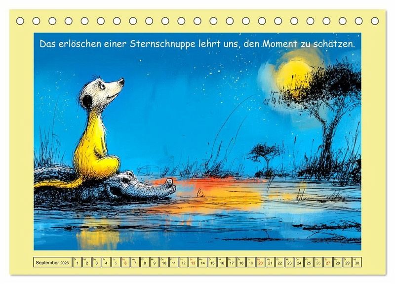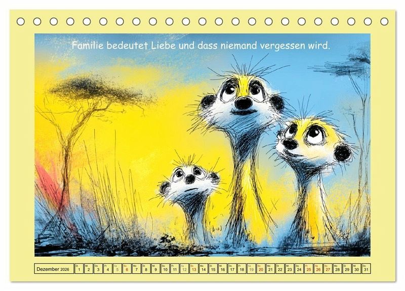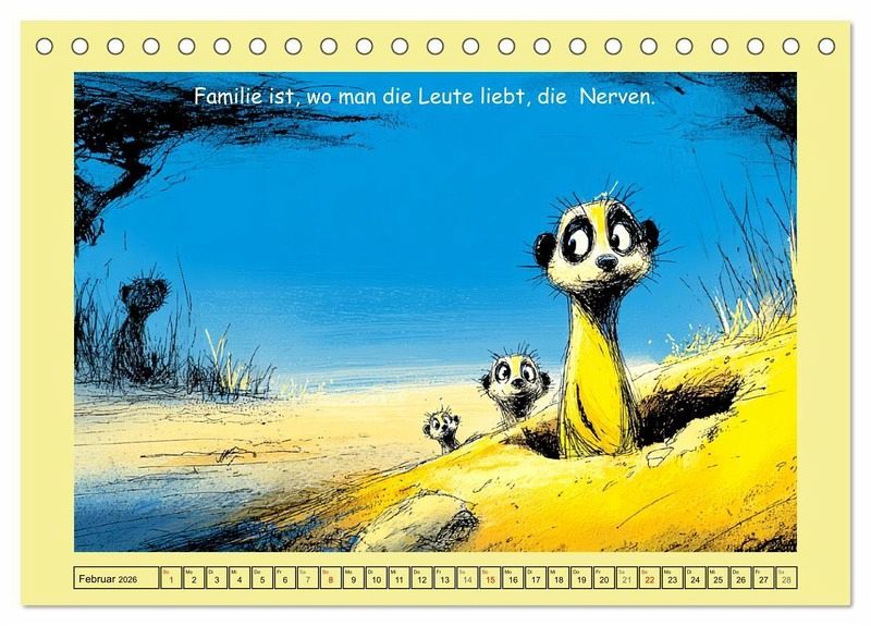 Dieser Kalender zeigt eine Welt kleiner Erdmännchen, die fröhlich, wachsam und voller Lebenslust ihre Umgebung erkunden. Die niedlichen Cartoons fangen Momente ein, die von Freundschaft, Mut, Neugier und leichtem Humor erzählt sind. Jedes Motiv wurde mit der Hilfe von KI erstellt und trägt eine Weisheit, die warm, positiv und manchmal zum Schmunzeln einlädt. Ein Kalender, der jeden Monat ein kleines Stück Sonne ins Herz bringt.