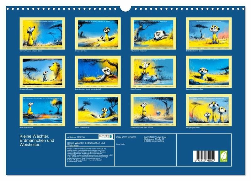 Dieser Kalender zeigt eine Welt kleiner Erdmännchen, die fröhlich, wachsam und voller Lebenslust ihre Umgebung erkunden. Die niedlichen Cartoons fangen Momente ein, die von Freundschaft, Mut, Neugier und leichtem Humor erzählt sind. Jedes Motiv wurde mit der Hilfe von KI erstellt und trägt eine Weisheit, die warm, positiv und manchmal zum Schmunzeln einlädt. Ein Kalender, der jeden Monat ein kleines Stück Sonne ins Herz bringt.