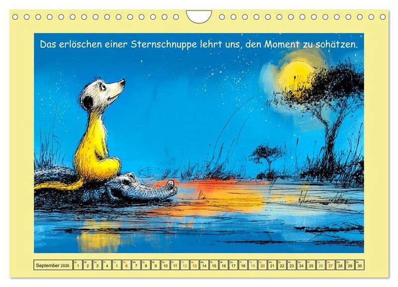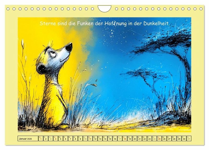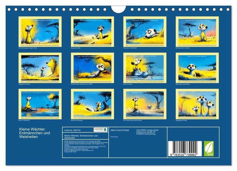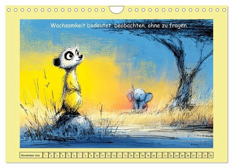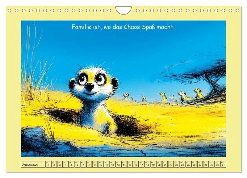 Dieser Kalender zeigt eine Welt kleiner Erdmännchen, die fröhlich, wachsam und voller Lebenslust ihre Umgebung erkunden. Die niedlichen Cartoons fangen Momente ein, die von Freundschaft, Mut, Neugier und leichtem Humor erzählt sind. Jedes Motiv wurde mit der Hilfe von KI erstellt und trägt eine Weisheit, die warm, positiv und manchmal zum Schmunzeln einlädt. Ein Kalender, der jeden Monat ein kleines Stück Sonne ins Herz bringt.