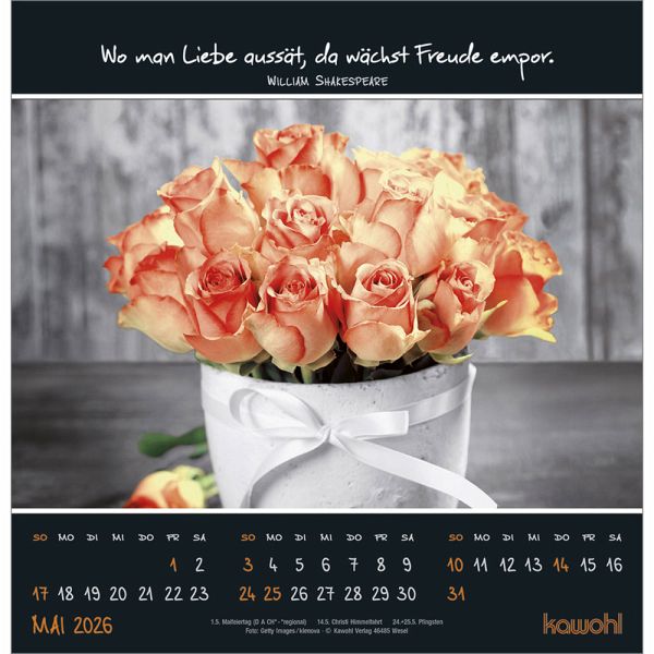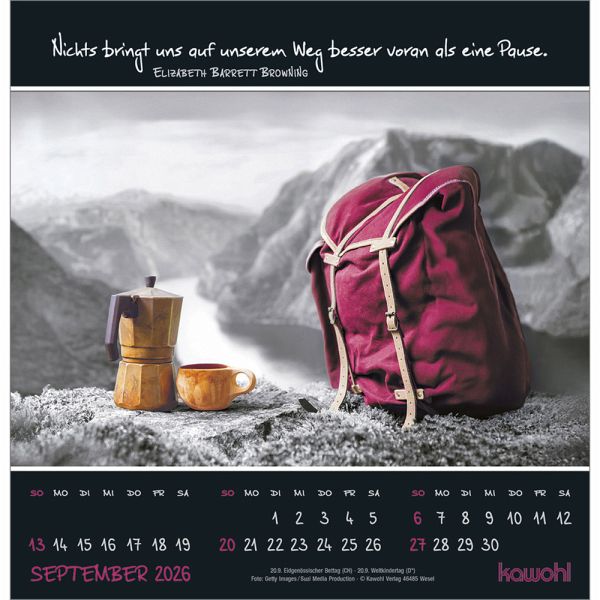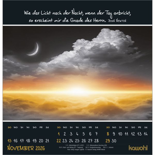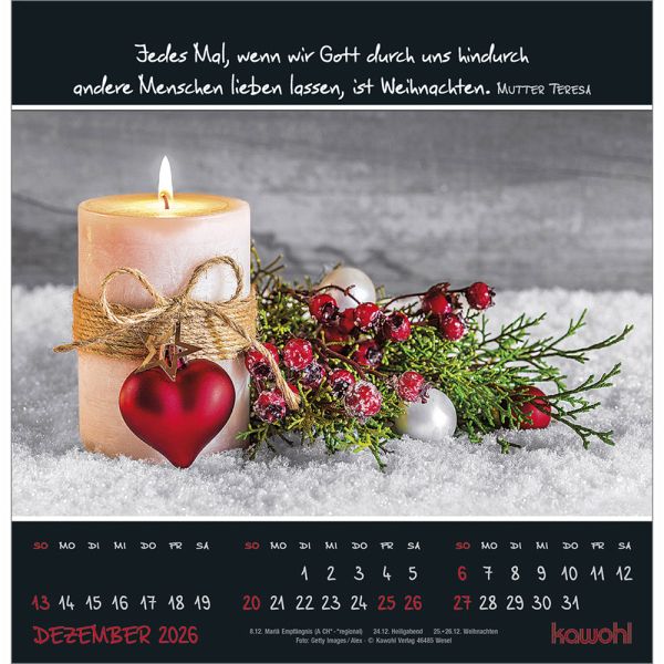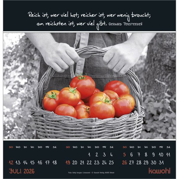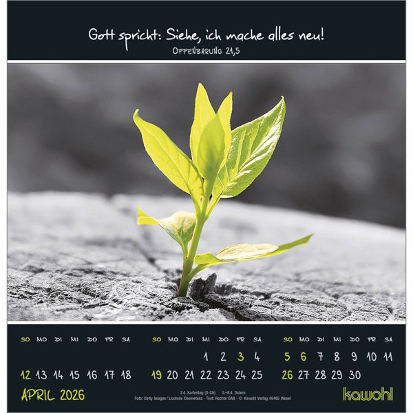 Wandkalender mit S/W-Fotos und farbigen HinguckernEntdecken Sie Tag für Tag kleine Wunder und erfreuen Sie sich an den farbenfrohen Bildelementen, die sich aus den modernen Schwarz-Weiß-Fotos hervorheben. Christliche Zitate, bemerkenswerte Sinnsprüche und prägnante Bibelverse unterstreichen die kunstvolle Bildersprache.Wand-Kalender:- mit christlichen Texten und Bibelversen- Fotos: Schwarz-bunt extra (s/w-Fotos mit Farbakzent)- Kunstdruck-Papier