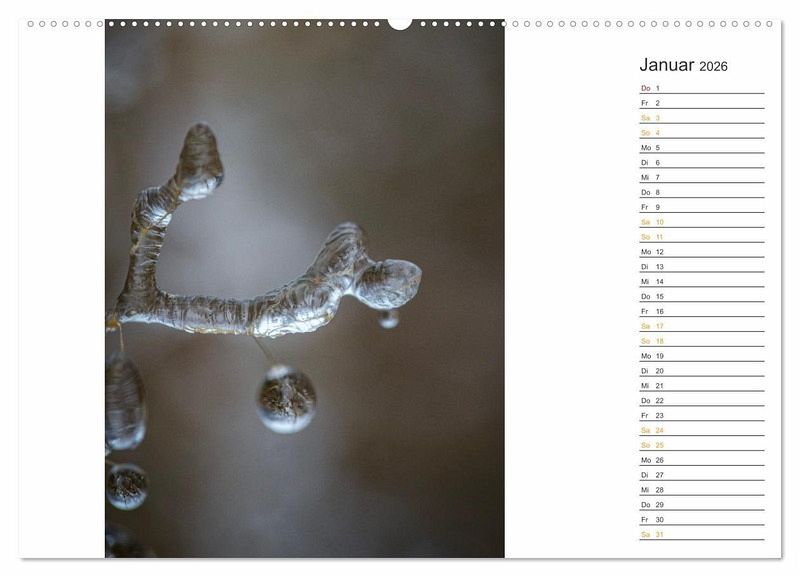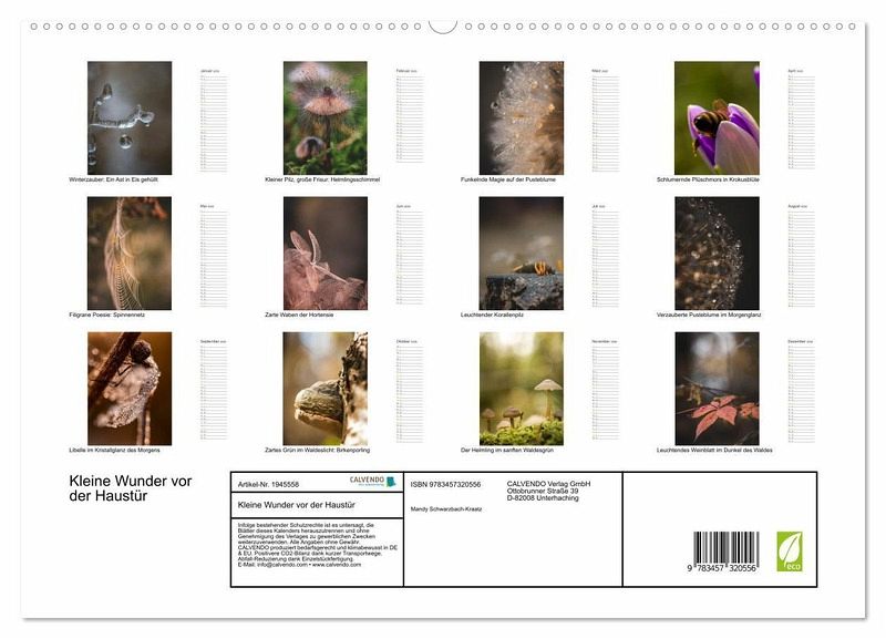 Alle Fotos in diesem Kalender sind direkt vor der Haustür entstanden und zeigen faszinierende Nahaufnahmen aus unserer heimischen Natur. Sie erinnern uns daran, dass täglich kleine Wunder darauf warten, entdeckt zu werden - auch vor Ihrer Haustür. Lassen Sie sich Monat für Monat inspirieren, den Blick für die Schönheit in Ihrem Alltag zu schärfen.