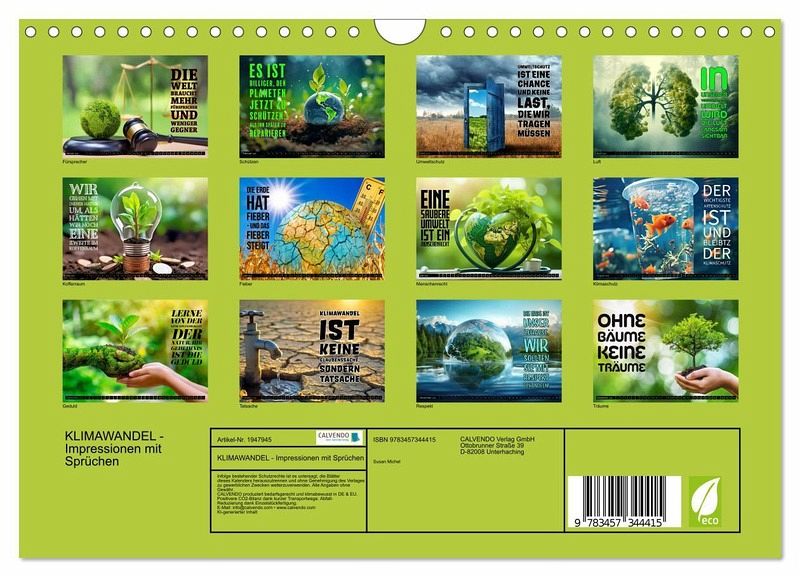 QUALITÄT - Hochwertiger Fotokalender mit 12 wunderschönen Motiven auf lichtbeständigem Bilderdruckpapier, robuste Spiralbindung mit Aufhängebügel.NACHHALTIG - deutliche Abfallreduzierung durch bedarfsgerechte Einzelstückfertigung, umweltfreundliches FSC-zertifiziertes Papier, Produktion in Deutschland, klimabewusste Logistik.PERFEKTES GESCHENK - Kalender für Freunde und Familie, für Kinder und Erwachsene, jung und alt, zu Weihnachten, Geburtstag oder zwischendurch.VIELFALT - Bildkalender in verschiedenen Formaten, z.B. DIN A5, DIN A4, DIN A3 sowie DIN A2. Ob Naturmotiv, Gemälde oder Fotos, ideal für ein persönliches Wohlfühlambiente.Handeln wir jetzt, um unsere Zukunft zu sichern von Autor(in): Susan Michel