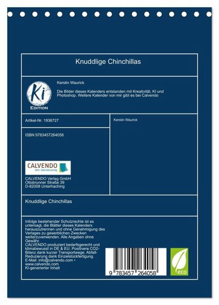 QUALITÄT - Hochwertiger Fotokalender mit 12 wunderschönen Motiven auf lichtbeständigem Bilderdruckpapier, robuste Spiralbindung.NACHHALTIG - deutliche Abfallreduzierung durch bedarfsgerechte Einzelstückfertigung, umweltfreundliches FSC-zertifiziertes Papier, Produktion in Deutschland, klimabewusste Logistik.PERFEKTES GESCHENK - Kalender für Freunde und Familie, für Kinder und Erwachsene, jung und alt, zu Weihnachten, Geburtstag oder zwischendurch.VIELFALT- Bildkalender in verschiedenen Formaten, z.B. DIN A5, DIN A4, DIN A3 sowie DIN A2. Ob Naturmotiv, Gemälde oder Fotos, ideal für ein persönliches Wohlfühlambiente.Zauberhafte Chinchillas - Ein Jahr mit den flauschigsten Gefährten von Autor(in): Kerstin Waurick