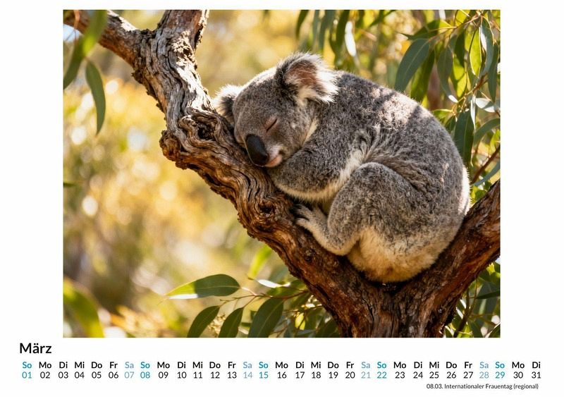 Tief in den Eukalyptuswäldern Australiens, hoch oben in den Baumkronen, verbringt ein besonderes Beuteltier den Großteil seines Lebens schlafend. Der Kalender "Koala" fängt die ruhige und friedliche Ausstrahlung dieser einzigartigen Tiere in zwölf Monatsmotiven ein und begleitet durch das Jahr mit dem gemütlichen Eukalyptus-Fresser aus Australien. Dieser Kalender ist eine gute Wahl für: * Freunde der australischen Tierwelt * Menschen, die eine ruhige und entspannte Atmosphäre schätzen * Suchende nach einem besonderen Geschenk für Tierliebhaber Jeder Monat präsentiert eine neue Szene aus dem Leben des gemütlichen Eukalyptusfressers. Die Motive zeigen die Tiere in ihrer natürlichen Umgebung, mal beim Klettern, mal beim Fressen der Blätter oder einfach nur entspannt in einer Astgabel ruhend. Jede dieser Darstellungen wurde durch das Zusammenspiel von kreativen Impulsen und komplexen Rechenprozessen digital erschaffen, um die charakteristische Sanftmut der Koalas einzufangen. Mit dem Kauf dieses Kalenders kann man Folgendes erwarten: * Zwölf Monatsblätter mit Motiven von Koalas * Ein praktisches Kalendarium für die Jahresplanung * Ein dekorativer Wandschmuck für Zuhause oder das Büro Der Kalender "Koala" ist mehr als nur ein Zeitplaner; er ist eine tägliche Erinnerung an die friedliche Welt der australischen Beuteltiere. Er begleitet durch das Jahr mit Bildern, die Gelassenheit ausstrahlen. Ein Blick auf die Monatsvorschau lohnt sich, um die gemütliche Art der Koalas selbst zu erleben.
