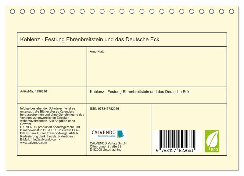 QUALITÄT - Hochwertiger Fotokalender mit 12 wunderschönen Motiven auf lichtbeständigem Bilderdruckpapier, robuste Spiralbindung.NACHHALTIG - deutliche Abfallreduzierung durch bedarfsgerechte Einzelstückfertigung, umweltfreundliches FSC-zertifiziertes Papier, Produktion in Deutschland, klimabewusste Logistik.PERFEKTES GESCHENK - Kalender für Freunde und Familie, für Kinder und Erwachsene, jung und alt, zu Weihnachten, Geburtstag oder zwischendurch.VIELFALT - Bildkalender in verschiedenen Formaten, z.B. DIN A5, DIN A4, DIN A3 sowie DIN A2. Ob Naturmotiv, Gemälde oder Fotos, ideal für ein persönliches Wohlfühlambiente.Sehenswertes in Koblenz von Autor(in): Arno Klatt
