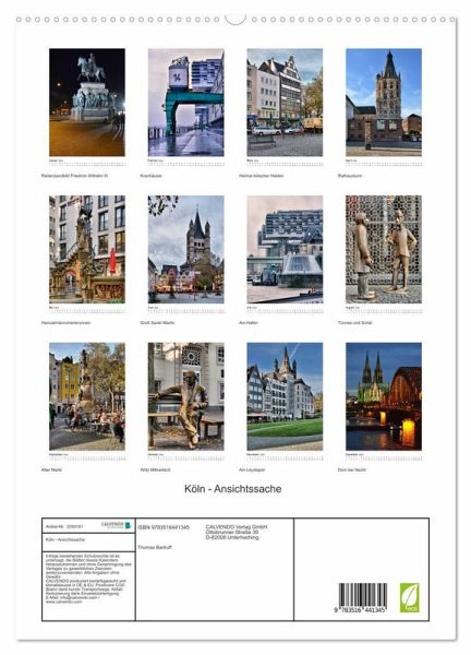 PREMIUM-LINIE - Brillanter Fotokalender mit 12 wunderschönen Motiven, Kunstdruck in Hochglanz in Museumsqualität.QUALITÄT - edle Materialien, stabile Rückwand mit 2 innovativen Einstecktaschen für eine optimale Präsentation an der Wand.NACHHALTIG - deutliche Abfallreduzierung durch bedarfsgerechte Einzelstückfertigung, umweltfreundliches FSC-zertifiziertes Papier, Produktion in Deutschland, klimabewusste Logistik.PERFEKTES GESCHENK - Kalender für Freunde und Familie, für Kinder und Erwachsene, jung und alt, zu Weihnachten, Geburtstag oder zwischendurch.12 Impressionen aus der rheinischen Metropole von Autor(in): Thomas Bartruff