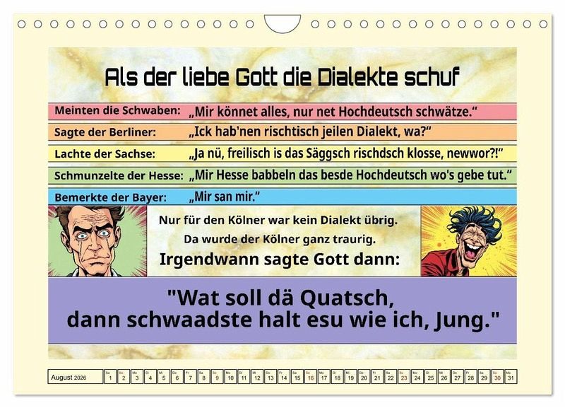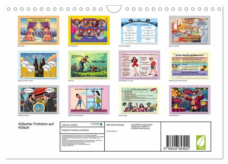 QUALITÄT - Hochwertiger Fotokalender mit 12 wunderschönen Motiven auf lichtbeständigem Bilderdruckpapier, robuste Spiralbindung mit Aufhängebügel.NACHHALTIG - deutliche Abfallreduzierung durch bedarfsgerechte Einzelstückfertigung, umweltfreundliches FSC-zertifiziertes Papier, Produktion in Deutschland, klimabewusste Logistik.PERFEKTES GESCHENK - Kalender für Freunde und Familie, für Kinder und Erwachsene, jung und alt, zu Weihnachten, Geburtstag oder zwischendurch.VIELFALT - Bildkalender in verschiedenen Formaten, z.B. DIN A5, DIN A4, DIN A3 sowie DIN A2. Ob Naturmotiv, Gemälde oder Fotos, ideal für ein persönliches Wohlfühlambiente.Lustige Cartoons zum Schmunzeln von Autor(in): Claudia Kleemann