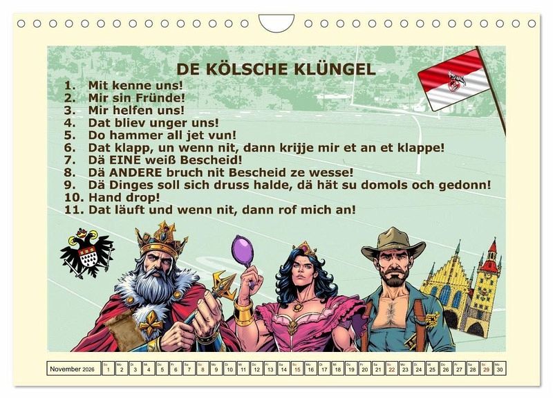 Die Kölner Lebensart ist geprägt von einer offenen, herzlichen und geselligen Atmosphäre. Man sagt oft, dass die Kölner das Leben feiern - sei es bei Karneval, in den zahlreichen Brauhäusern oder bei den vielen Festivals. Die Stadt hat eine lebendige Kulturszene, die von Kunst, Musik und Theater bis hin zu Sport und Gastronomie reicht. Der Dialekt, den die Kölner sprechen, ist das Kölsch. Kölsch ist ein rheinischer Dialekt, der sich durch seine eigene Melodie und spezielle Ausdrücke auszeichnet. Typische Kölner Sprüchenwurden mit KI-generierten Catroons in Szene gesetzt.