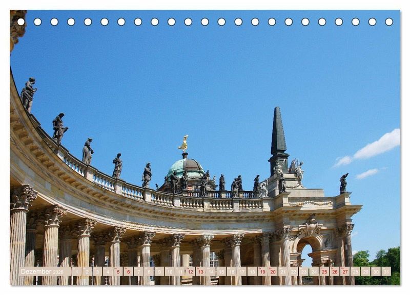 Das eindrucksvolle Schlösserensemble Sanssouci in der weitläufigen Parkanlage ist ein Magnet für Besucher aus aller Welt. In Potsdam, dem 'Versailles des Nordens', und seiner Umgebung künden 14 Schlösser von der Baulust preußischer Könige. Genießen Sie in diesem Kalender Ansichten von Schloss Babelsberg, Sanssouci, Orangerieschloss, Neues Palais und einiger Versorgungsgebäude wie Dampfmaschinenhaus und Meierei.