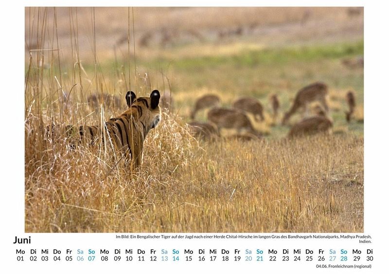 Tauchen Sie ein in die majestätische Welt des Königstigers! Unser hochwertiger Wandkalender präsentiert 12 atemberaubende Motive dieser beeindruckenden Großkatze - perfekt für Natur- und Tierliebhaber. Jedes Bild wurde sorgfältig ausgewählt und auf lichtbeständigem Bilderdruckpapier in brillanter Qualität gedruckt. Genießen Sie Monat für Monat die kraftvolle Eleganz des Tigers in Ihrem Zuhause oder Büro. Gedruckt in Deutschland auf FSC-zertifiziertem Papier, vereint dieser Kalender Nachhaltigkeit und Ästhetik. Holen Sie sich ein Stück Wildnis an Ihre Wand und lassen Sie sich von der Schönheit des Königstigers inspirieren! Hochwertig Erleben Sie ein Jahr voller Eleganz mit unserem Premium-Fotokalender. Jedes der 12 Motive ist auf hochwertigem, lichtbeständigem Bilderdruckpapier gedruckt, um die Lebendigkeit jedes Bildes zu bewahren. Die robuste Spiralbindung gewährleistet Langlebigkeit und einfache Handhabung. Nachhaltig Unser Engagement für die Umwelt spiegelt sich in jedem Exemplar wider. Durch die Produktion auf Abruf reduzieren wir signifikant unseren Abfall. Wir verwenden ausschließlich umweltfreundliches, FSC-zertifiziertes Papier. Stolz gefertigt in Deutschland, achten wir bei unserer Logistik auf Klimaschutz, um unseren ökologischen Fußabdruck zu minimieren. Das ideale Geschenk Dieser Kalender ist das perfekte Präsent für jeden Anlass - ob Weihnachten, Geburtstage oder einfach als liebevolle Aufmerksamkeit zwischendurch. Geeignet für Freunde, Familie, Kinder und Erwachsene gleichermaßen, bereichert er jedes Zuhause mit seiner Vielfalt und Schönheit, unabhängig vom Alter der Beschenkten.