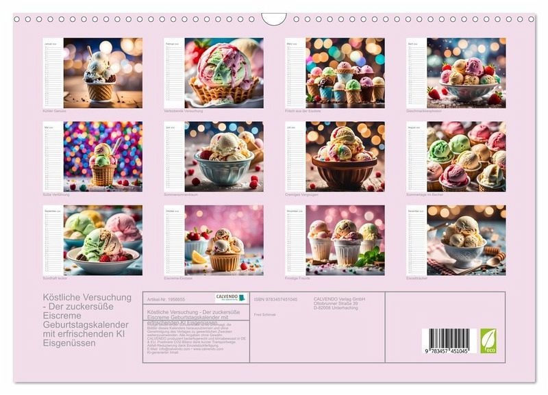 In diesem "Köstliche Versuchung" Geburtstagskalender tauchen Sie ein in eine Welt der süßen Genüsse. Der Autor hat mit Hilfe von KI und Photoshop Eiscreme-Bilder erstellt, die Ihre Sinne verzaubern werden. Jeder Monat lässt einem das Wasser im Mund zusammenlaufen. Verpassen Sie nie wieder einen Geburtstag und lassen Sie sich von der süßen Seite des Lebens begleiten!
