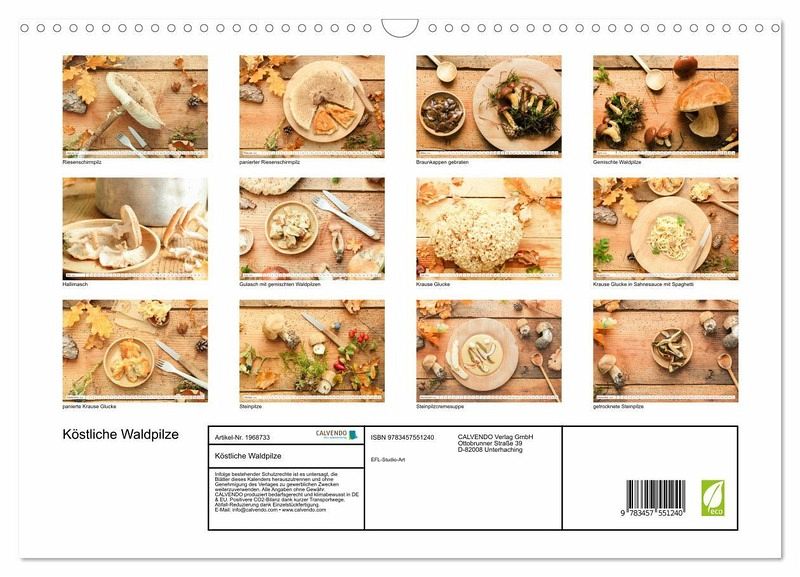 QUALITÄT - Hochwertiger Fotokalender mit 12 wunderschönen Motiven auf lichtbeständigem Bilderdruckpapier, robuste Spiralbindung mit Aufhängebügel.NACHHALTIG - deutliche Abfallreduzierung durch bedarfsgerechte Einzelstückfertigung, umweltfreundliches FSC-zertifiziertes Papier, Produktion in Deutschland, klimabewusste Logistik.PERFEKTES GESCHENK - Kalender für Freunde und Familie, für Kinder und Erwachsene, jung und alt, zu Weihnachten, Geburtstag oder zwischendurch.VIELFALT - Bildkalender in verschiedenen Formaten, z.B. DIN A5, DIN A4, DIN A3 sowie DIN A2. Ob Naturmotiv, Gemälde oder Fotos, ideal für ein persönliches Wohlfühlambiente.Viele tolle Pilzgerichte für jeden Monat. von Autor(in): EFLStudioArt