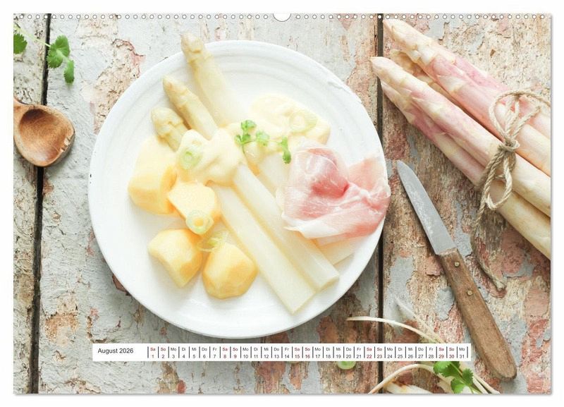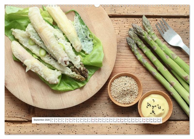 Ein Kalender für Spargelfreunde mit verschiedenen Spargelgerichten. Tolle Gerichte für zu Hause neu entdecken mit Zutaten aus Wald und Wiese. Gerichte mit grünem, weißem und violettem Spargel sind sehr schmackhaft.