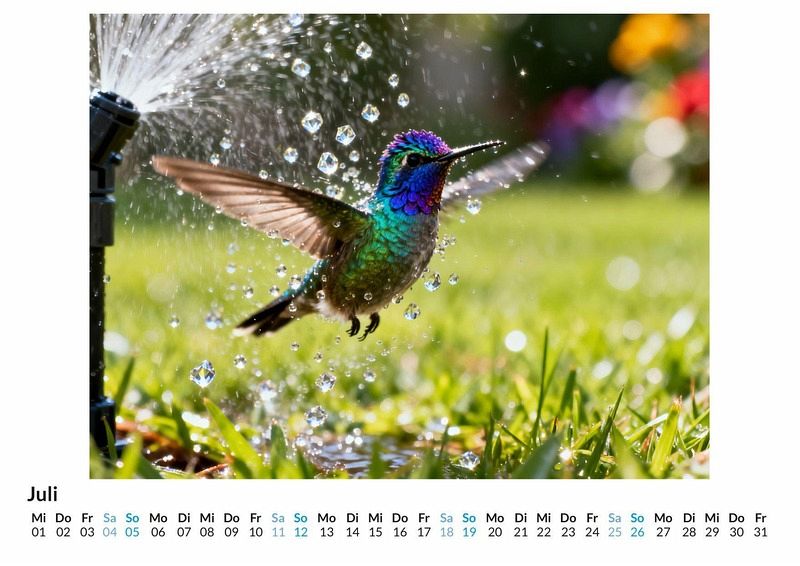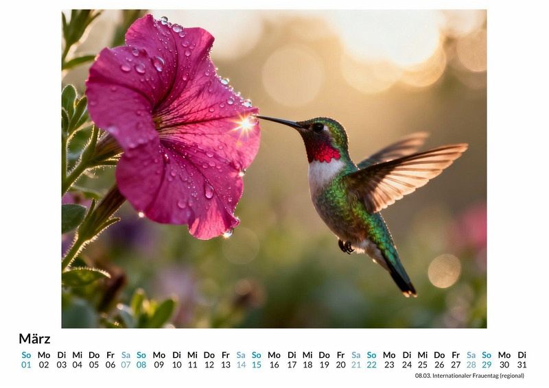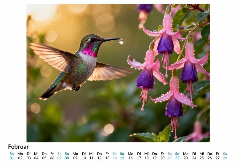 Kaum größer als ein Daumen, aber voller Energie und Farbe. Kolibris sind die Akrobaten der Vogelwelt, deren Flügelschlag für das menschliche Auge fast unsichtbar ist. Sie schweben vor Blüten, ein flirrendes Schauspiel aus schillernden Federn und Präzision. Der Kalender "Kolibri" fängt diese flüchtigen Momente ein und widmet sich dem Thema: Winzig, schnell und farbenfroh. Dieser Kalender ist eine gute Wahl: * Für alle, die von der Natur und ihren kleinen Wundern begeistert sind. * Für Beobachter der Vogelwelt, die das Detail schätzen. * Für Menschen, die Freude an lebendigen Farben und dynamischen Motiven haben. Jeder Monat enthüllt eine neue Darstellung dieser faszinierenden Vögel. Die Motive zeigen die Kolibris in ihrer ganzen Pracht, umgeben von exotischen Pflanzen. Jedes einzelne Bild wurde dabei durch einen kreativen Algorithmus aus einer Fülle von Informationen zu einer einzigartigen Komposition zusammengefügt, die die Realität auf besondere Weise interpretiert. So entsteht eine Sammlung von Ansichten, die den Betrachter in eine Welt voller Bewegung und Farbenpracht mitnimmt. Was der Kalender bietet: * Zwölf Monatsmotive, die die Lebendigkeit der Kolibris zeigen. * Ein übersichtliches Kalendarium für die Planung von Terminen. * Ein dekorativer Wandschmuck für Zuhause oder das Büro. Der Kalender "Kolibri" ist eine Hommage an die winzigen, schnellen und farbenfrohen Juwelen der Natur. Er begleitet durch das Jahr mit Motiven voller Dynamik und Lebensfreude. Ein Blick auf die Monatsansichten lohnt sich, um die Vielfalt dieser besonderen Vögel zu erleben.