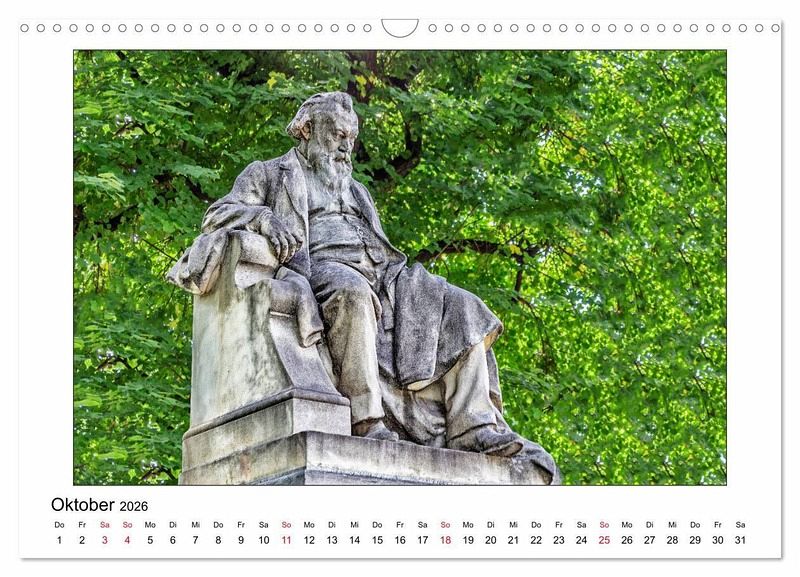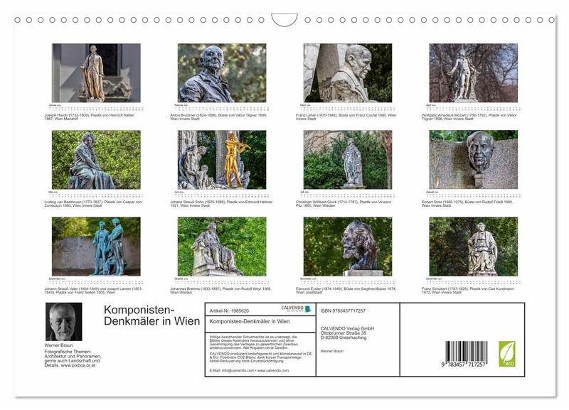 Wien präsentiert sich gerne als Musikstadt. Vielen Musikern hat man daher auch Denkmäler gesetzt, dieser Kalender zeigt die wichtigsten davon. Im Zentrum stehen die Vertreter der Wiener Klassik, aber es ist auch die Stauß-Dynastie vertreten, sowie bedeutende Operettenkomponisten.