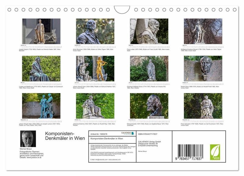Wien präsentiert sich gerne als Musikstadt. Vielen Musikern hat man daher auch Denkmäler gesetzt, dieser Kalender zeigt die wichtigsten davon. Im Zentrum stehen die Vertreter der Wiener Klassik, aber es ist auch die Stauß-Dynastie vertreten, sowie bedeutende Operettenkomponisten.