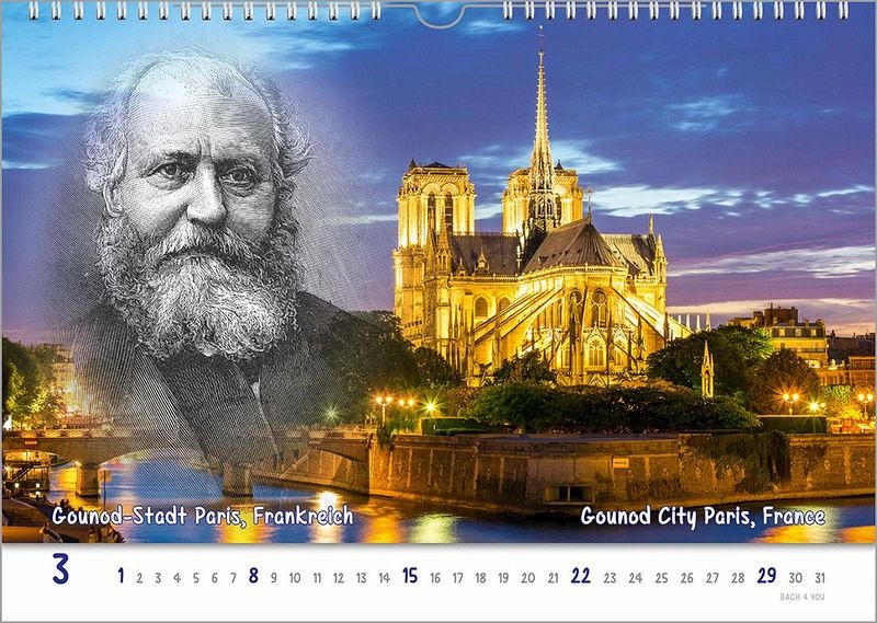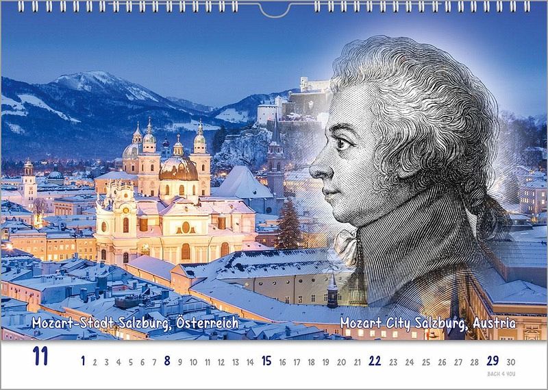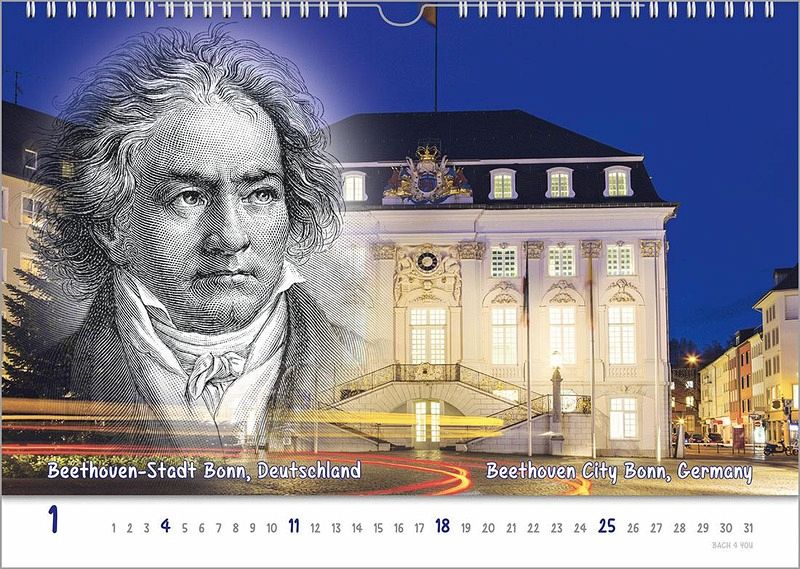 Ein edler Komponisten-Kalender, ein starker Musik-Kalender, ein cooles Musik-Geschenk 2026. Auf den Monatsblättern dieses kleinen Kalenderkunstwerkes finden Holzstiche und aktuelle Fotos zusammen. Es sind die ganz Großen der klassischen Musik, die vor begeisternden Fotos der sogenannten Musikerstädte eingebunden sind. Zwölf klassische Komponisten wie Mozart, Beethoven, Bach, Gounod, Haydn, Berlioz, Schubert, Händel, Brahms, Mendelssohn Bartholdy, Weber und Strauss ergeben mit ausgesucht edlen Städteaufnahmen ein harmonisches Miteinander. Man verbindet Mozart mit Salzburg, Strauss mit Wien und Leipzig mit Johann Sebastian Bach. Aber es gibt mehr solche Städte. Die zwölf spannendsten sind zu diesem besonderen Komponisten-Kalender - es ist auch ein Musik-Kalender - zusammen gefasst. Das Kalendarium dieses Musik-Kalenders, bzw. Komponisten-Kalenders ist so gehalten, dass es in allen Sprachen funktioniert.