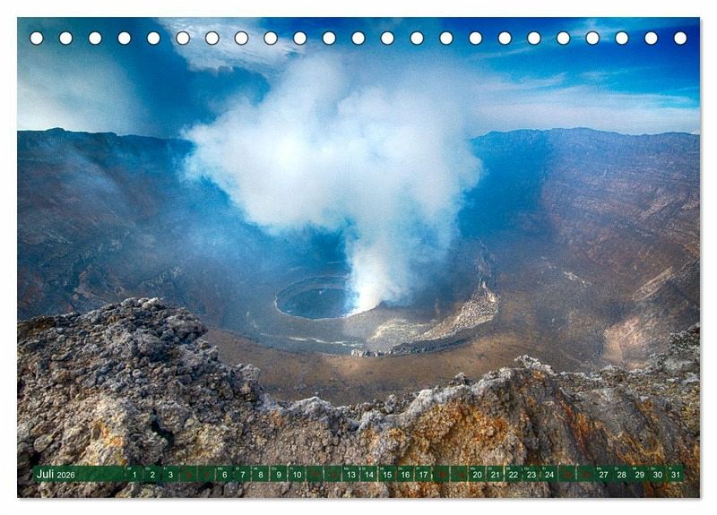 Juli: Der Krater des 3462 m hohen Nyiragongo-Vulkans mit seinem flüssigen Lavasee. Der Nyiragongo ist Teil der Virunga-Kette und zählt zu den gefährlichsten Vulkanen der Erde.