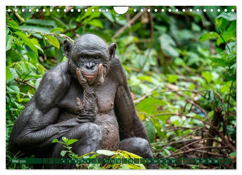 Mai: Bonobo (Pan paniscus). Bonobos sind die kleinsten der vier Menschenaffenarten und leben nur südlich des Kongo-Flusses in einer äußerst abgelegenen Region. DR Kongo.