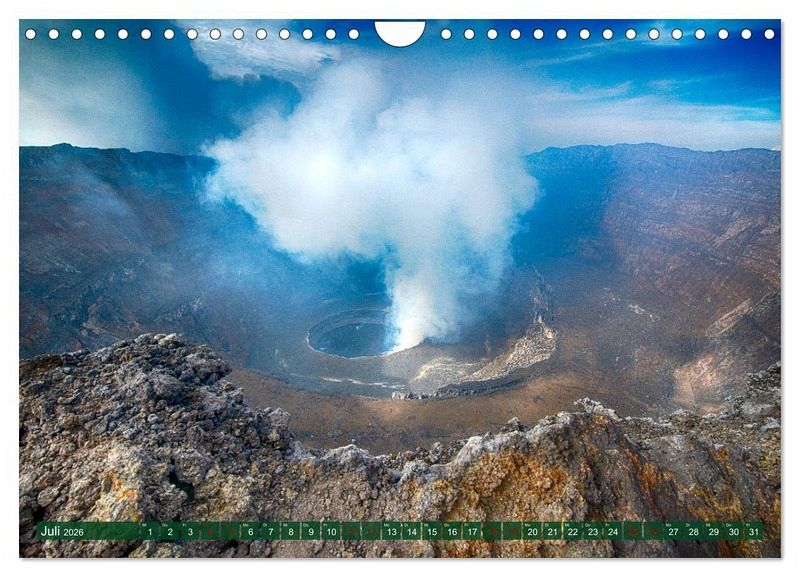 Juli: Der Krater des 3462 m hohen Nyiragongo-Vulkans mit seinem flüssigen Lavasee. Der Nyiragongo ist Teil der Virunga-Kette und zählt zu den gefährlichsten Vulkanen der Erde.