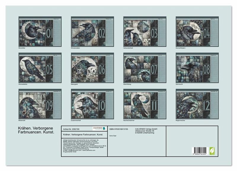 QUALITÄT - Hochwertiger Fotokalender mit 12 wunderschönen Motiven auf lichtbeständigem Bilderdruckpapier, robuste Spiralbindung mit Aufhängebügel.NACHHALTIG - deutliche Abfallreduzierung durch bedarfsgerechte Einzelstückfertigung, umweltfreundliches FSC-zertifiziertes Papier, Produktion in Deutschland, klimabewusste Logistik.PERFEKTES GESCHENK - Kalender für Freunde und Familie, für Kinder und Erwachsene, jung und alt, zu Weihnachten, Geburtstag oder zwischendurch.VIELFALT - Bildkalender in verschiedenen Formaten, z.B. DIN A5, DIN A4, DIN A3 sowie DIN A2. Ob Naturmotiv, Gemälde oder Fotos, ideal für ein persönliches Wohlfühlambiente.Krähen in künstlerischen Abbildungen mit Seele und Ausdruck von Autor(in): Irene Saar