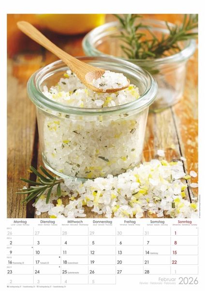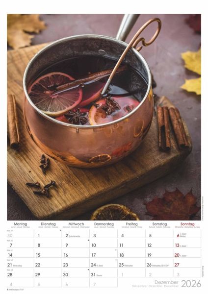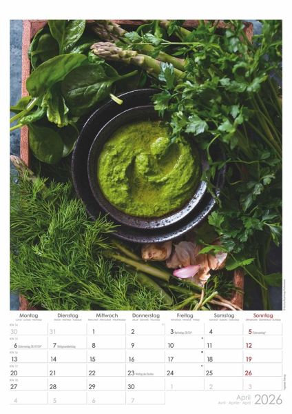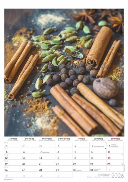 Dieser schöne Wandkalender im A3 Format zieht nicht nur in der Küche alle Blicke auf sich. Lassen Sie sich in die Welt der Gewürze entführen! Farbexplosionen sind in jedem Monat garantiert, denn wer bietet eine breitere Vielfalt an außergewöhnlichen Farben als leuchtend grüne Kräuter und exotische Gewürze?Der attraktive Kräuterkalender hat ein großes Format von 29,7 x 42 cm (A3) und bringt dadurch die bezaubernden Bilder hervorragend zur Geltung. Im viersprachigen Kalendarium unter den Bildmotiven ist ausreichend Platz für Ihre wichtigsten Terminnotizen. Die praktische Spiralbindung ermöglicht zudem ein einfaches Aufhängen und Umblättern der Kalenderseiten. Der Küchenkalender "Kräuter & Gewürze 2025" schmückt jeden Raum und ist zugleich auch eine schöne Geschenkidee.
