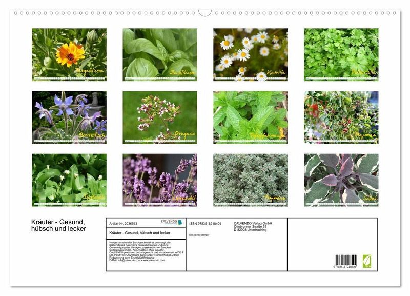 QUALITÄT - Hochwertiger Fotokalender mit 12 wunderschönen Motiven auf lichtbeständigem Bilderdruckpapier, robuste Spiralbindung mit Aufhängebügel.NACHHALTIG - deutliche Abfallreduzierung durch bedarfsgerechte Einzelstückfertigung, umweltfreundliches FSC-zertifiziertes Papier, Produktion in Deutschland, klimabewusste Logistik.PERFEKTES GESCHENK - Kalender für Freunde und Familie, für Kinder und Erwachsene, jung und alt, zu Weihnachten, Geburtstag oder zwischendurch.VIELFALT - Bildkalender in verschiedenen Formaten, z.B. DIN A5, DIN A4, DIN A3 sowie DIN A2. Ob Naturmotiv, Gemälde oder Fotos, ideal für ein persönliches Wohlfühlambiente.Gesundheit aus dem Kräutergarten von Autor(in): Elisabeth Stanzer