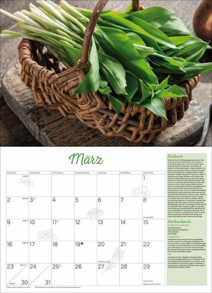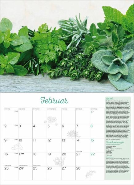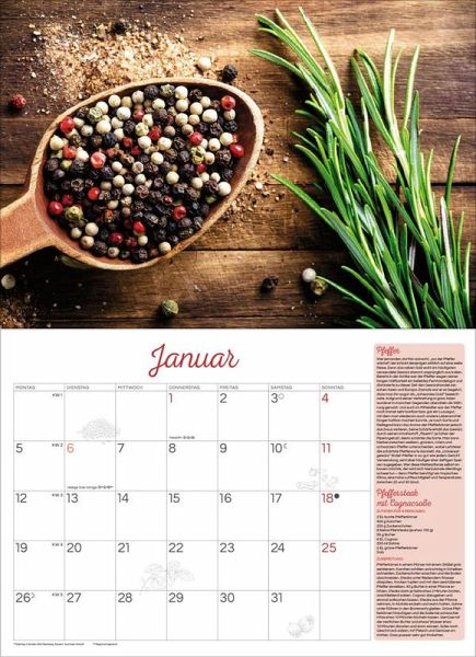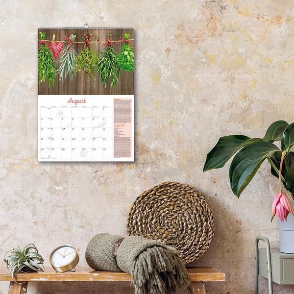 Der praktische Kalender zeigt 12 Stillleben mit Infotexten und Rezepten zu den beliebtesten Kräutern und Gewürzen. Mit viel Platz für Notizen und einer Übersicht mit Ferienterminen.